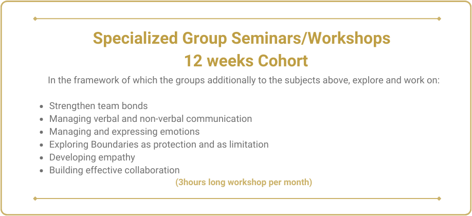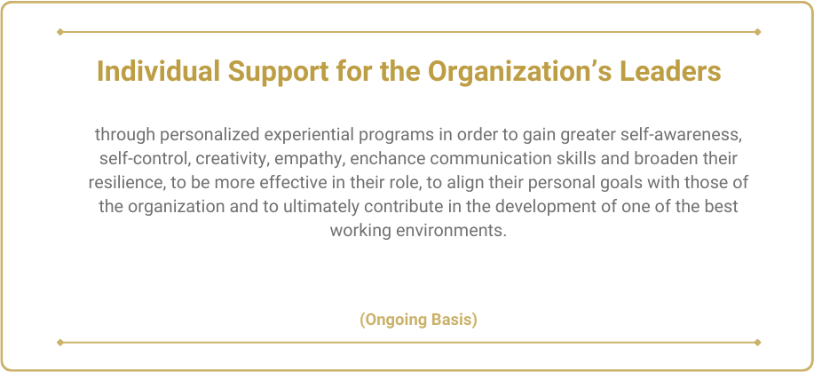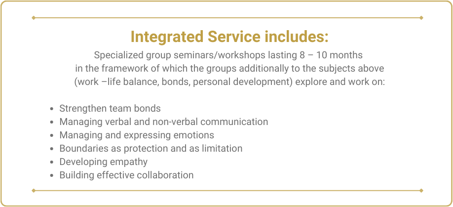 Working Alive Project’s successful implementation requires the foundation of solid and constant cooperation with the Company’s or Organization’s Leaders. Regular meetings with the Company’s Management Team, addressing Planning issues and mid/post evaluation of Project’s effectiveness, are an integral part of Working Alive Project’s indispensable processes.