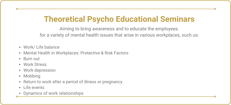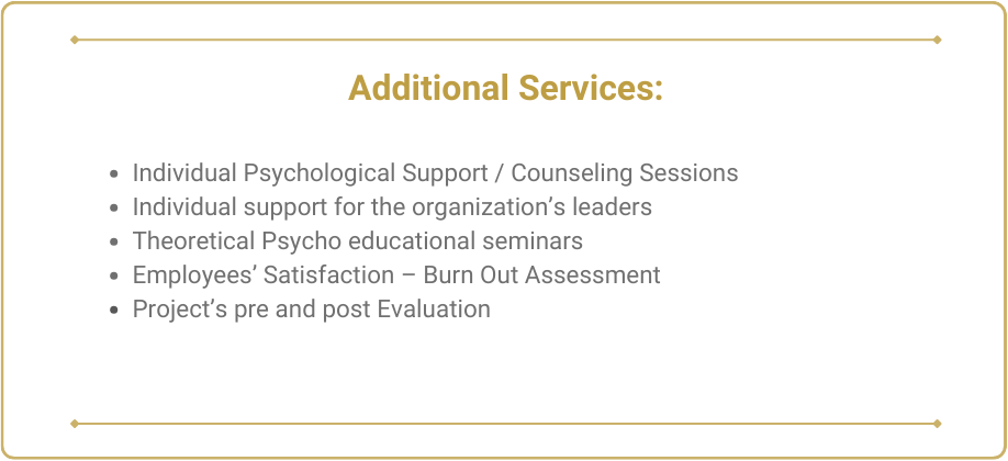 We design and implement a mental health program for your company based on your needs and vision, including each one of the services that you choose and covers your needs or a combination of them.